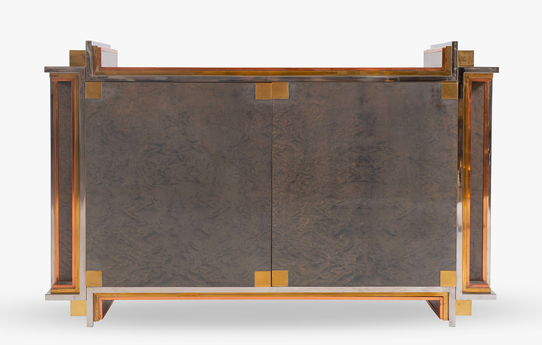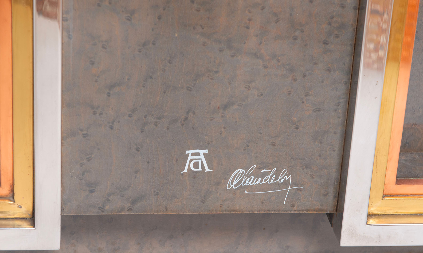 Descrizione: Corpo centrale in legno rivestito Erable grigio anche al retro, struttura in metallo cromato, ottone e rame, finiture in ottone, due ripiani interni, reca monogramma e firma Alain Delon sul fianco, H cm 87x13x50.