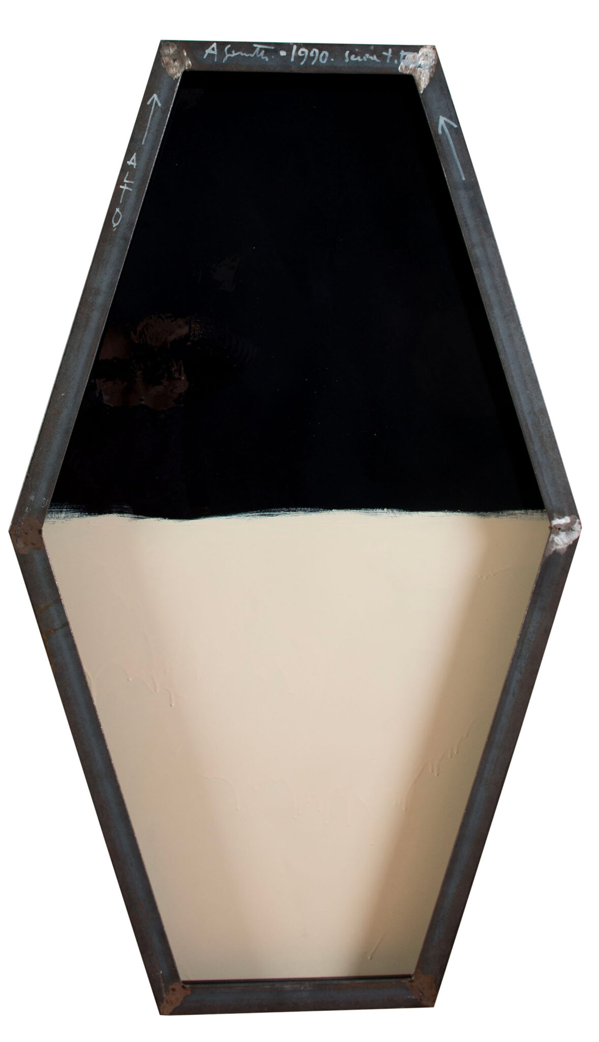 Descrizione: Smalto su cristallo entro cornice di ferro, firmato e datato al retro A Garutti – 1990, H cm 127×75.