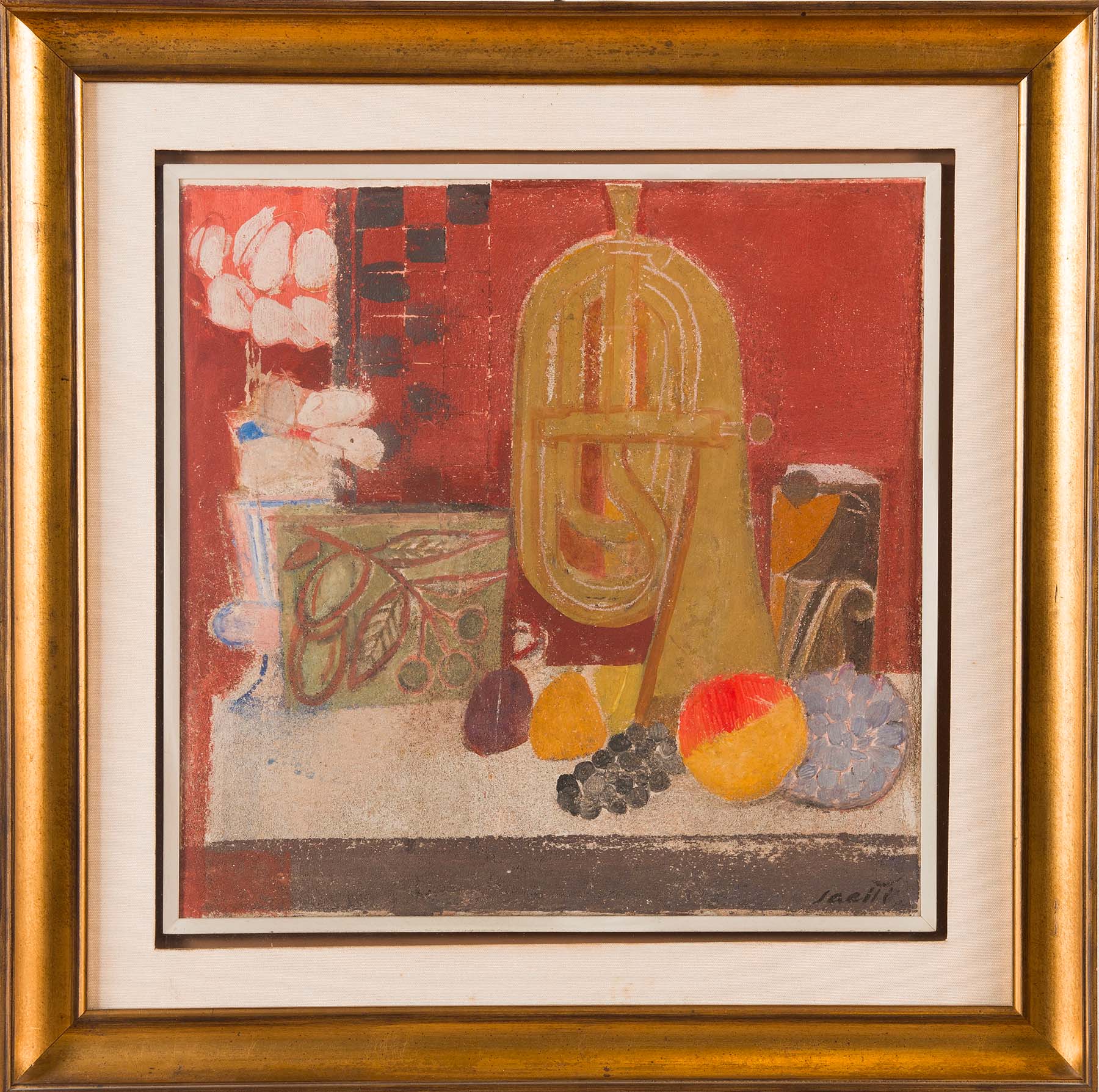 Realizzata nel 1974, “Composizione con la tromba” testimonia una fase matura della ricerca di Bruno Saetti, artista bolognese attivo tra Novecento italiano e secondo dopoguerra. In quest’opera, infatti, emerge con chiarezza il suo linguaggio sintetico, fondato su equilibrio formale e intensità cromatica. Tuttavia, la scelta dell’affresco su tela non è un dato secondario: al contrario, rivela la volontà di trasferire una tecnica murale in un formato autonomo, mantenendo la qualità opaca e compatta della superficie.
