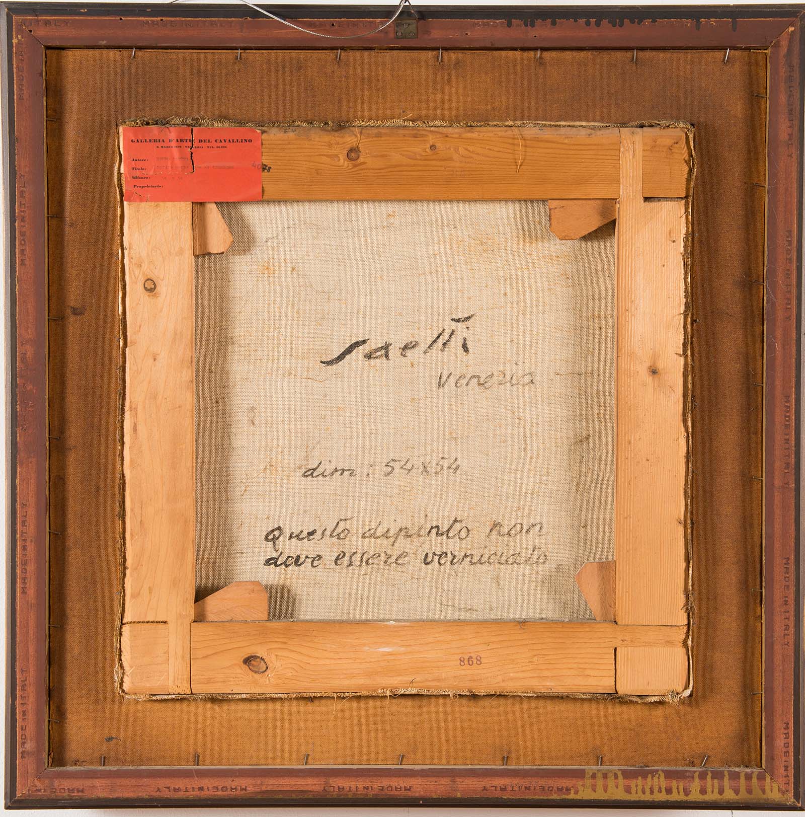 Descrizione: Affresco su tela, firmato in basso a destra Saetti, firma e iscrizione al retro ‘Saetti/Venezia/54×54/Questo dipinto non/deve essere verniciato’, H cm 54×54.