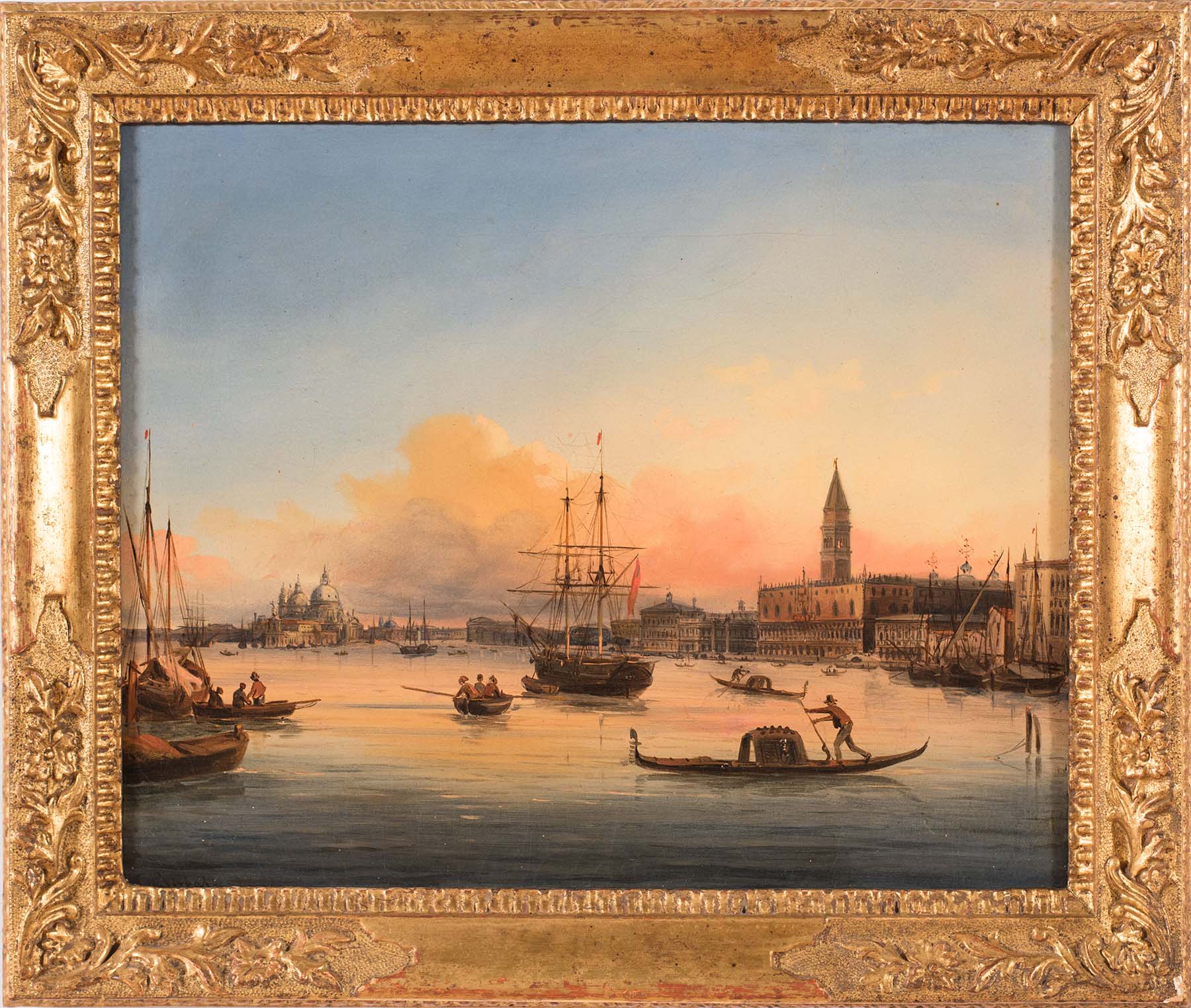 In quest’opera, il Bacino di San Marco si apre in una veduta ampia e ordinata, dove emergono con chiarezza il Palazzo Ducale, il Campanile e la Basilica della Salute sullo sfondo. Tuttavia, il vero protagonista è il tramonto, che avvolge la scena in una luce calda e dorata. Inoltre, le acque calme riflettono le architetture e le imbarcazioni, creando un equilibrio visivo che guida lo sguardo in profondità.