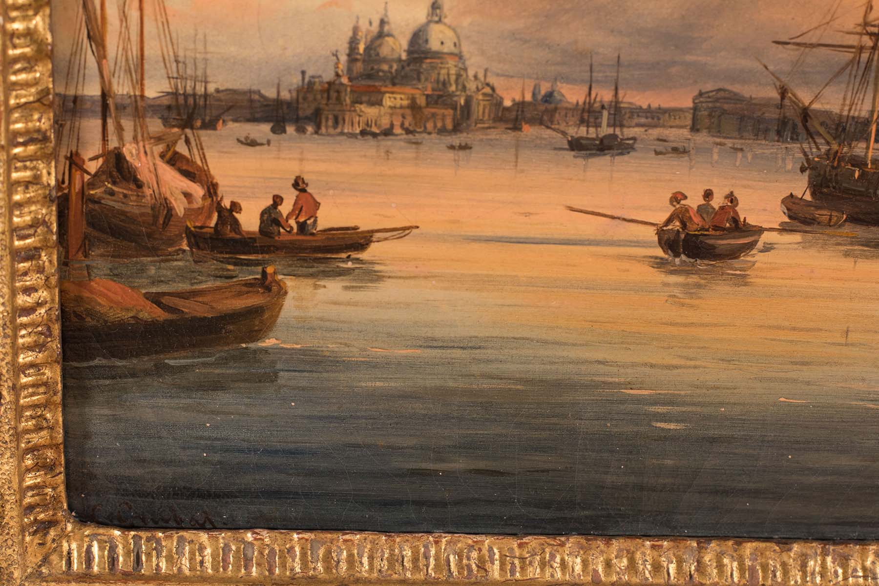 Le gondole e le piccole barche, distribuite con attenzione nello spazio, introducono un elemento narrativo discreto. Allo stesso tempo, la presenza delle figure contribuisce a restituire la dimensione quotidiana della città lagunare. Di conseguenza, la veduta non è soltanto una rappresentazione topografica, ma diventa un’immagine evocativa, destinata anche al collezionismo internazionale del Grand Tour.