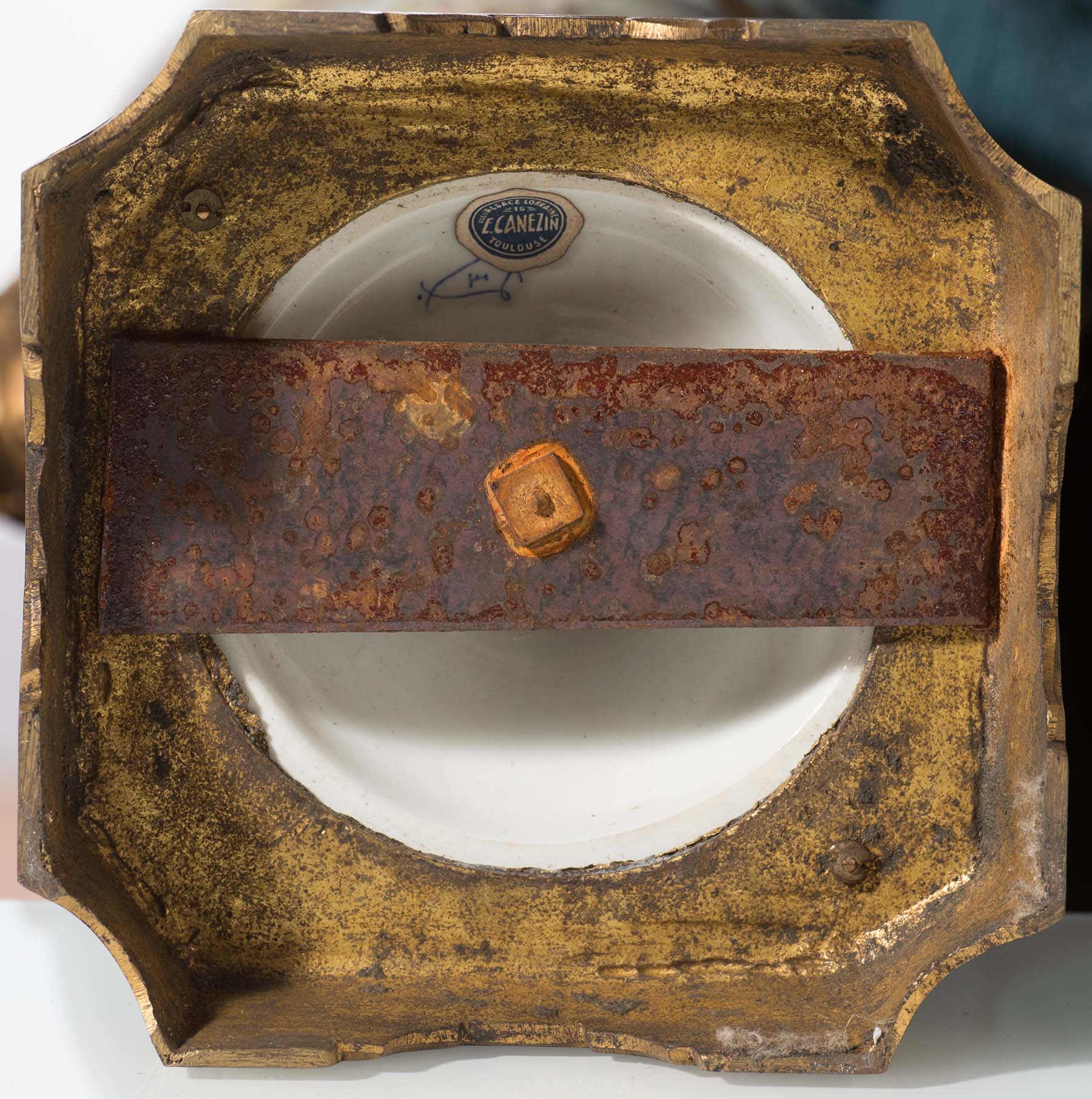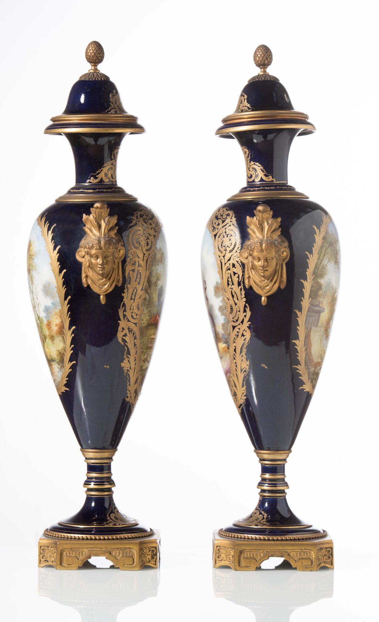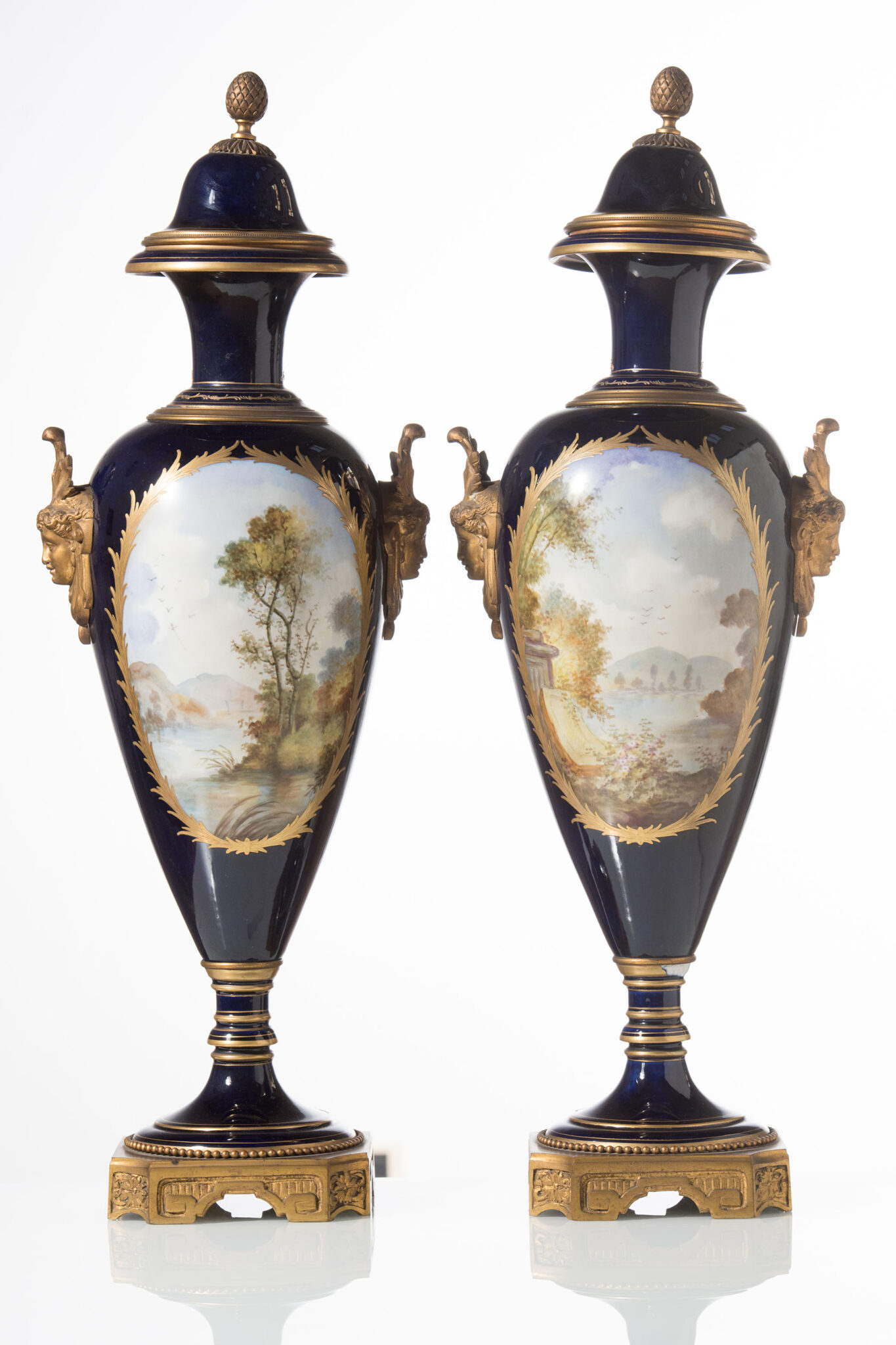Descrizione: Decori con dipinti policromi su entrambi i lati: anteriormente decoro a figure e paesaggi entro medaglioni su fondo blu cobalto firmati L. Bertren, posteriormente decoro a paesaggi. Montato in bronzo dorato, prese laterali con teste femminili, marcati sotto la base e sotto al coperchio F entro scudo in blu, H cm 70.