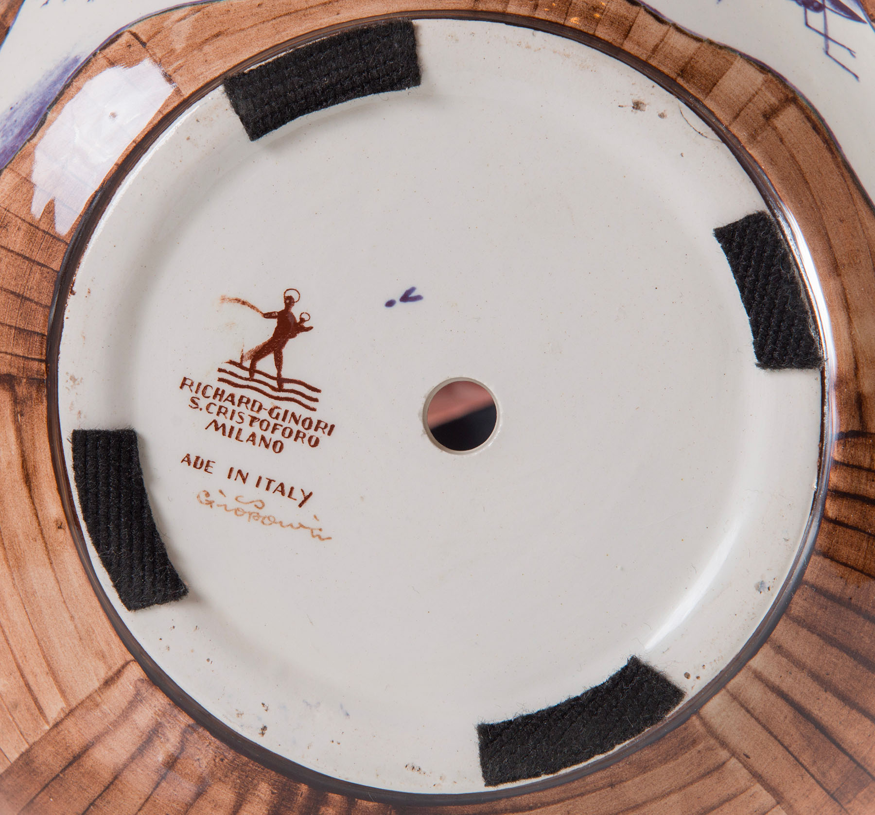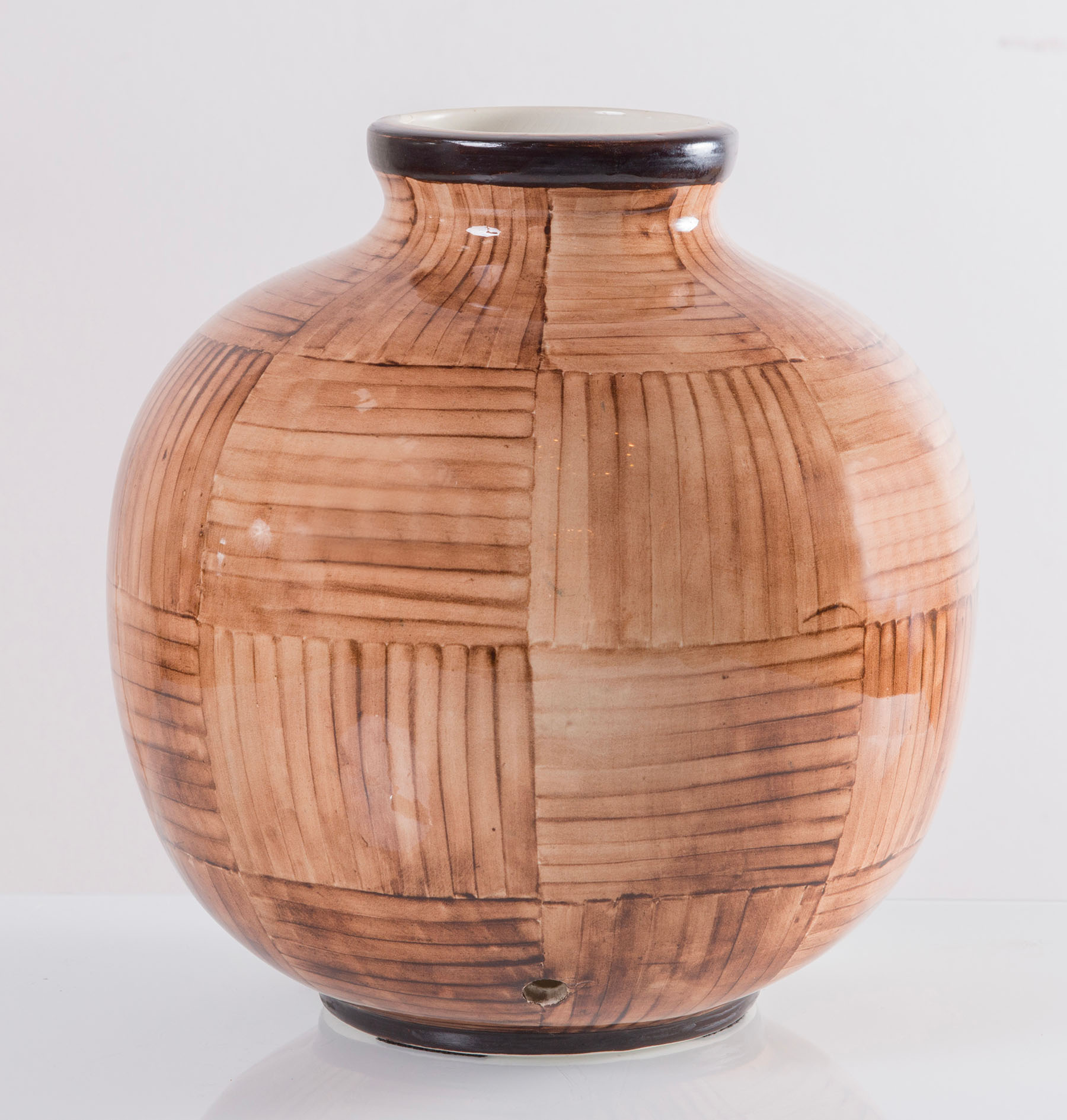 Descrizione: Stretto colletto e basso piede, ceramica decorata a scacchi di fasce alternate verticali e orizzontali a trama di paglia intrecciata, sulla parte anteriore decoro con vasi di fiori e insetti in policromia, sotto la base marchio della manifattura Richard Ginori – S. Cristoforo – Milano, Made in Italy e firma dell’autore, H cm 28 – diametro cm 22.