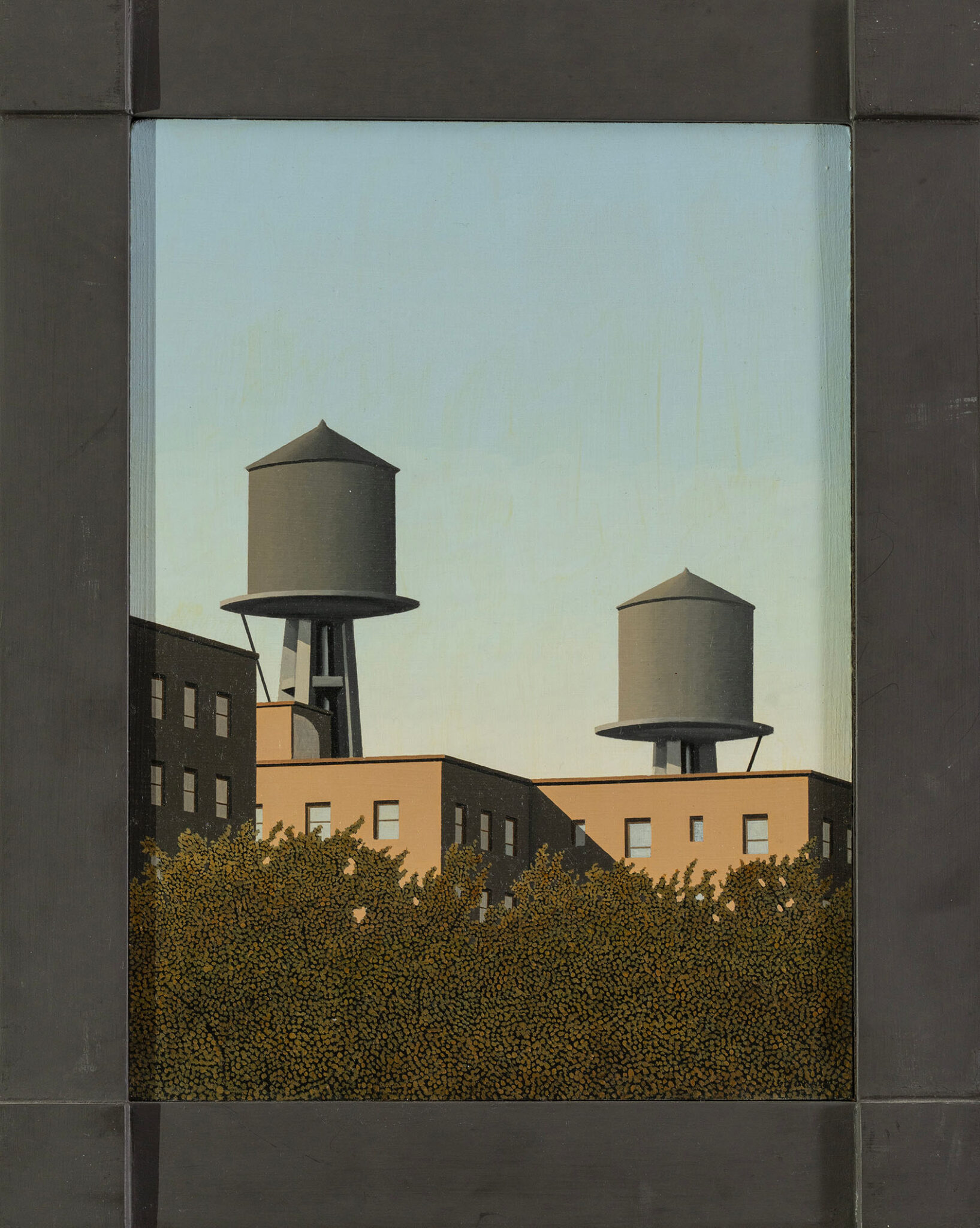 L’opera “Autunno” di Giorgio Tonelli cattura con straordinaria precisione la silenziosa bellezza urbana che caratterizza gran parte della sua produzione artistica. In questo dipinto, l’artista rappresenta un paesaggio cittadino essenziale, dominato da due cisterne d’acqua che svettano sopra gli edifici. Il cielo limpido e la luce cristallina creano un’atmosfera sospesa, mentre il rigore compositivo rimanda a una visione metafisica e contemplativa del reale.