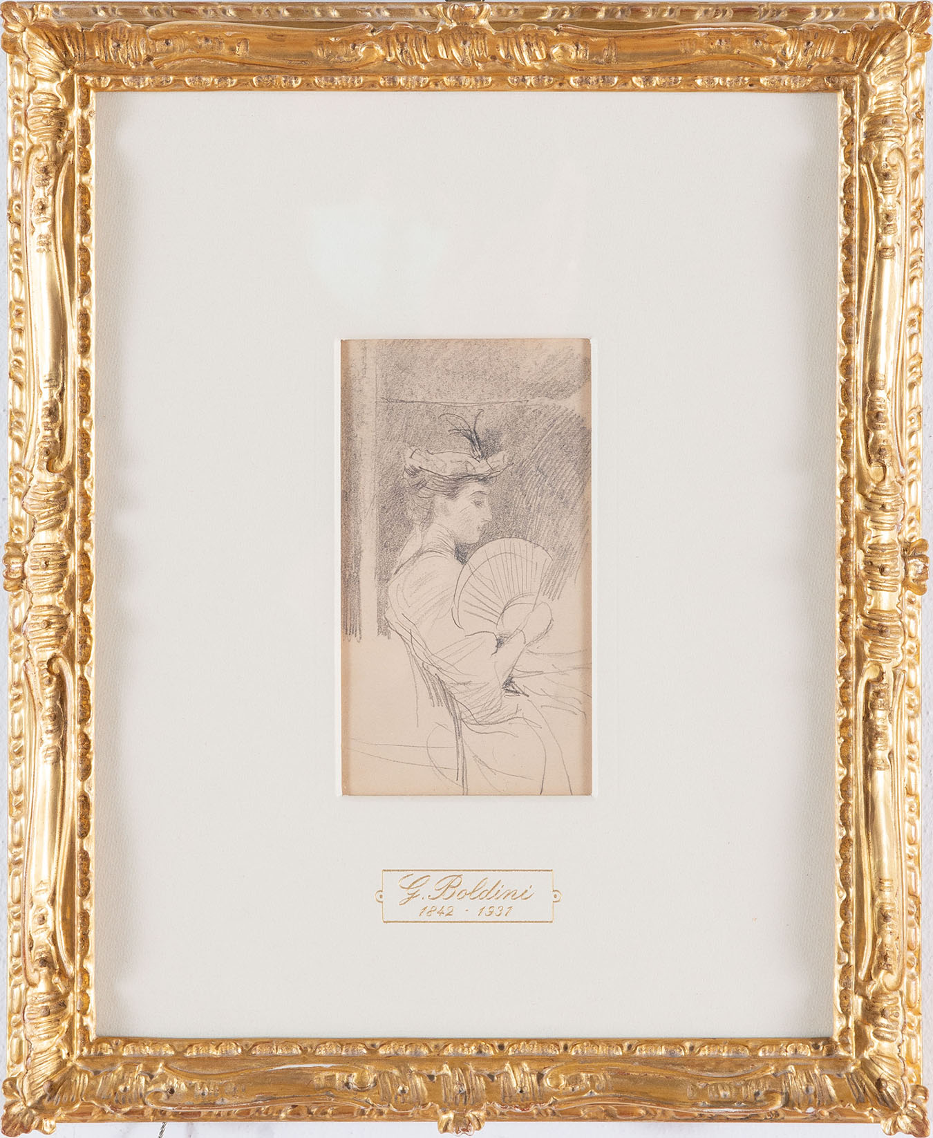 Il disegno “La signora del ventaglio”, realizzato da Giovanni Boldini intorno al 1915, testimonia con chiarezza l’eccellenza grafica raggiunta dall’artista nella piena maturità. L’opera raffigura una figura femminile colta di profilo, caratterizzata dall’uso elegante del ventaglio, elemento iconografico ricorrente nella produzione boldiniana e simbolo di grazia mondana.