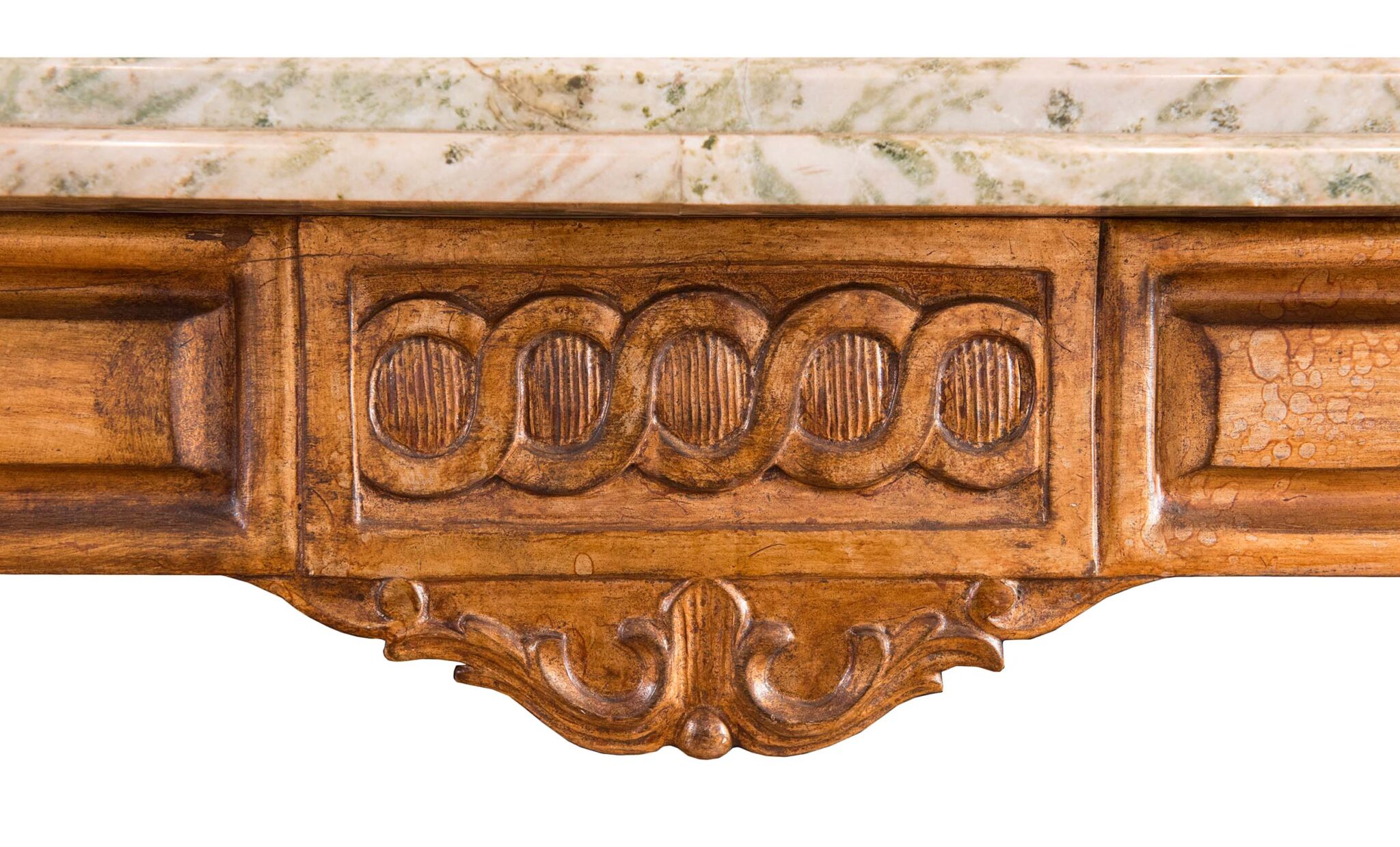 Descrizione: Piano con bordo a doppia linea spezzata, fasce decorate con intaglio a cerchi intersecati ed intaglio fogliaceo, quattro gambe tornite con rastremature, scanalature e foglie d’acanto chiuse, H cm 81x220x94.