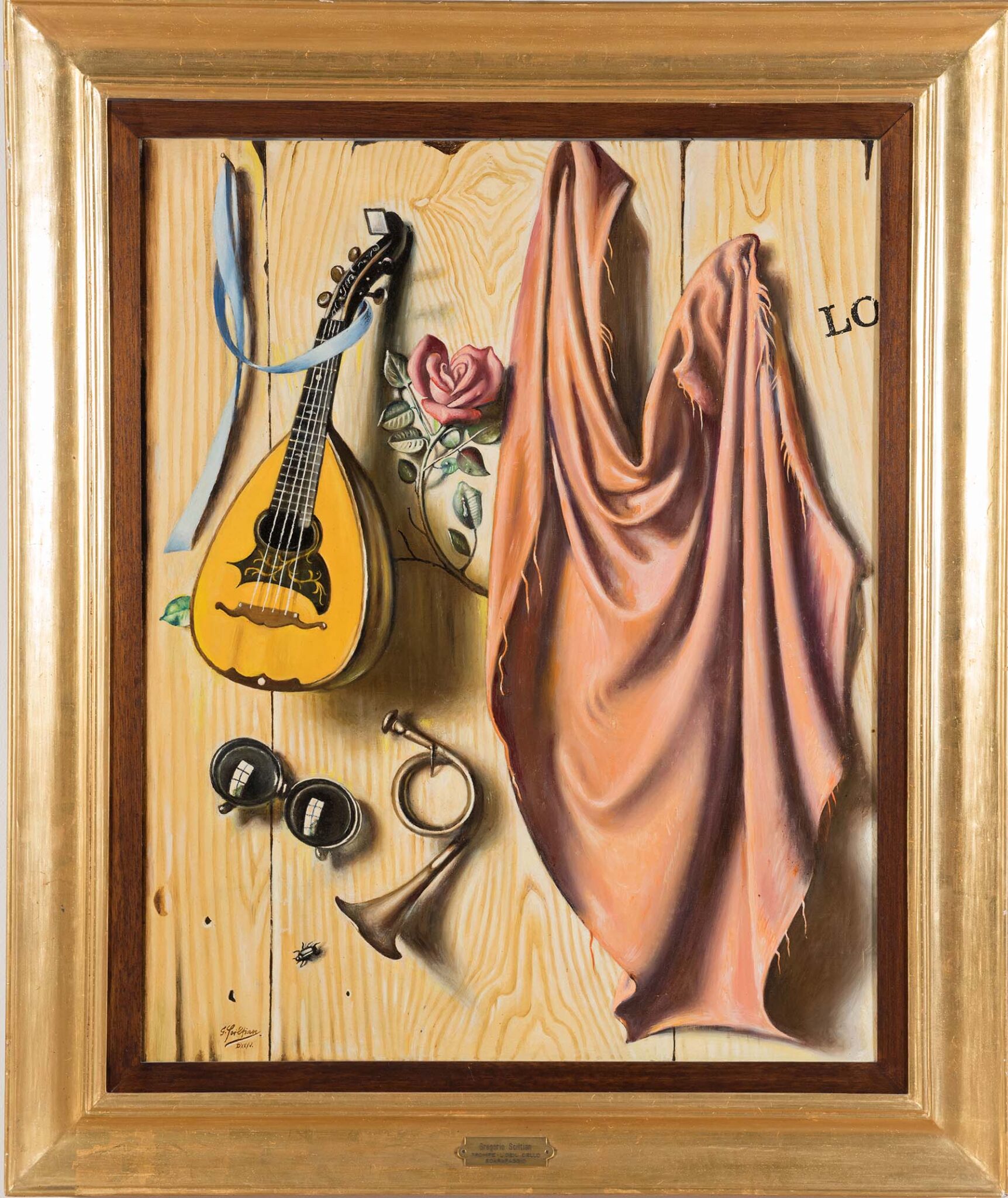 Descrizione: Olio su tela, firmato in basso a sinistra G. Sciltian e numeri romani, al retro reca iscrizione per autentica “Confermo che questo ‘Trompe l’oeil con panneggio rosa’ è stato dipinto a Roma nel 1981/Gregorio Sciltian/20-VIII-1984”, H cm 100×80.