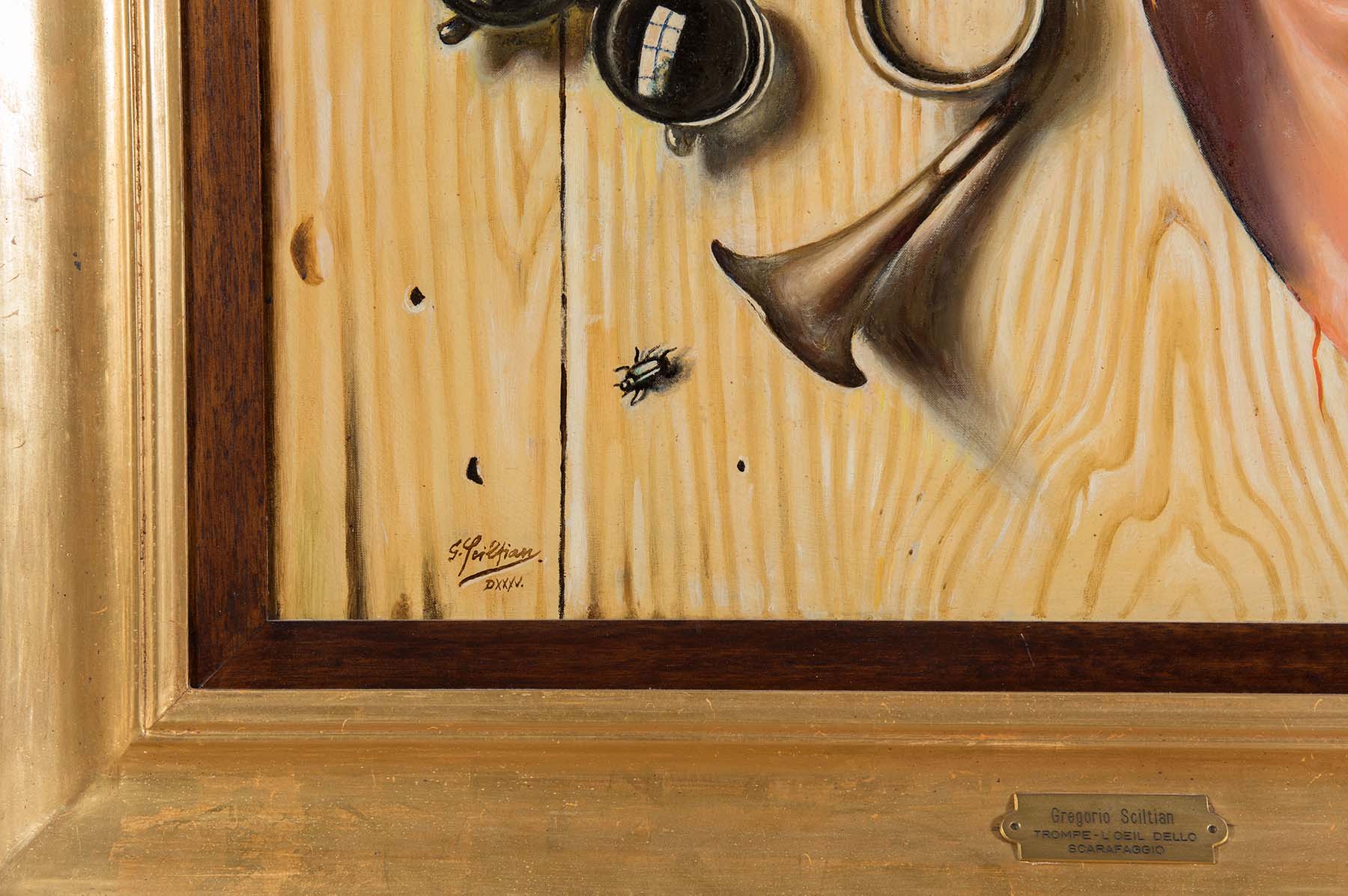Realizzato nel 1981, Trompe-l’oeil con lo scarafaggio appartiene alla fase tarda della produzione di Gregorio Sciltian, pittore nato nel 1900 a Nakhichevan-na-Donu e successivamente attivo in Italia per gran parte della sua carriera. In quest’opera, infatti, l’artista riafferma con decisione la propria adesione alla pittura illusionistica, cifra distintiva della sua ricerca sin dagli anni Trenta.