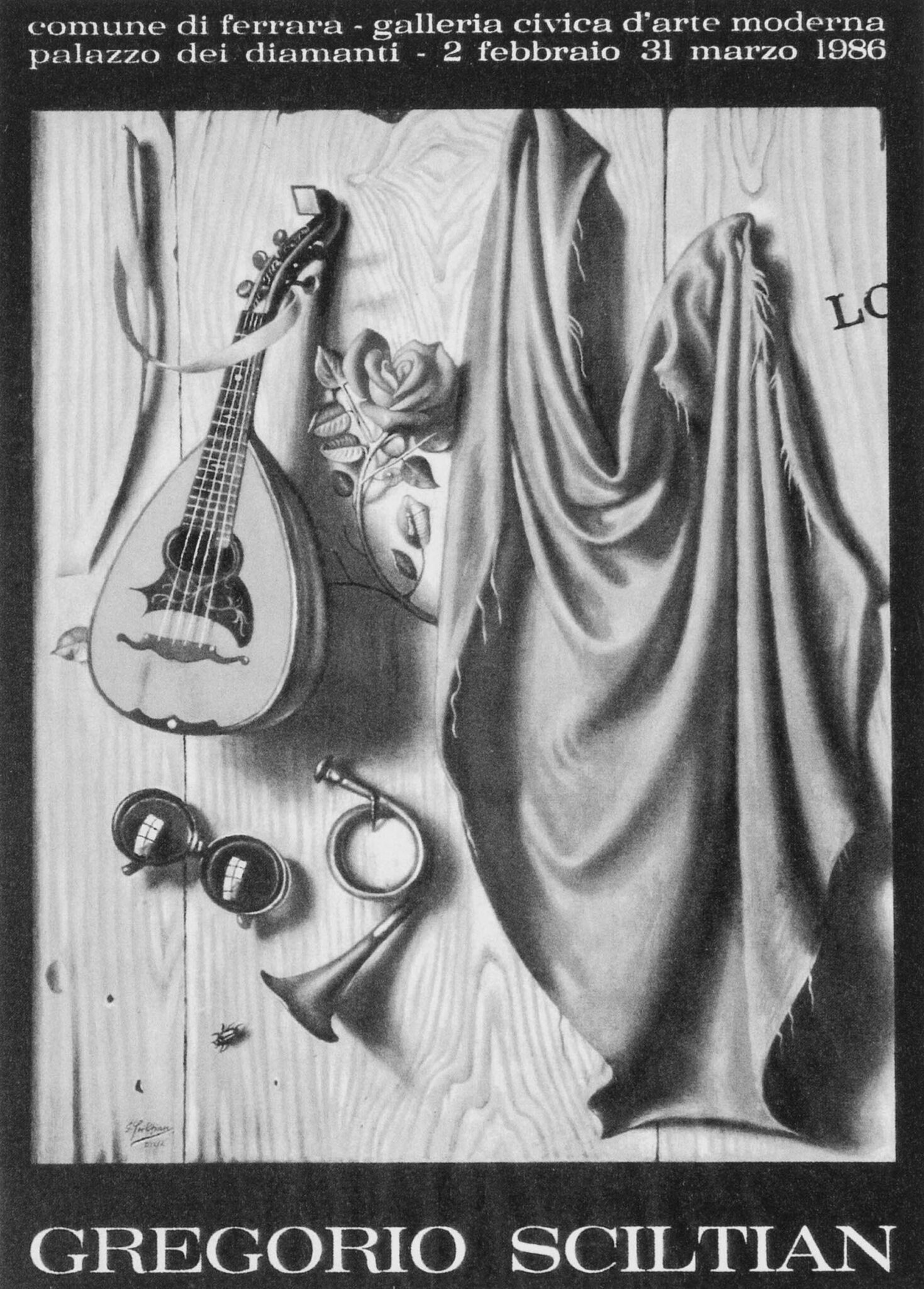 Pubblicazione: Opera pubblicata in ‘Sciltian – Opera Omnia’ a cura di R. Civello – Hoepli 1986, rif. bibliografico n.447; Catalogo ‘L’illusione di Sciltian – Inganni pittorici alla prova della modernità’ – Mostra a cura di Stefano Sbarbaro, 3 Aprile – 6 Settembre 2015, Villa Bardini a Firenze, pag. 199 – tav. 101; Locandina della mostra monografica dedicata a Gregorio Sciltian – Ferrara, Palazzo dei Diamanti, 2 Febbraio – 31 Marzo 1986.