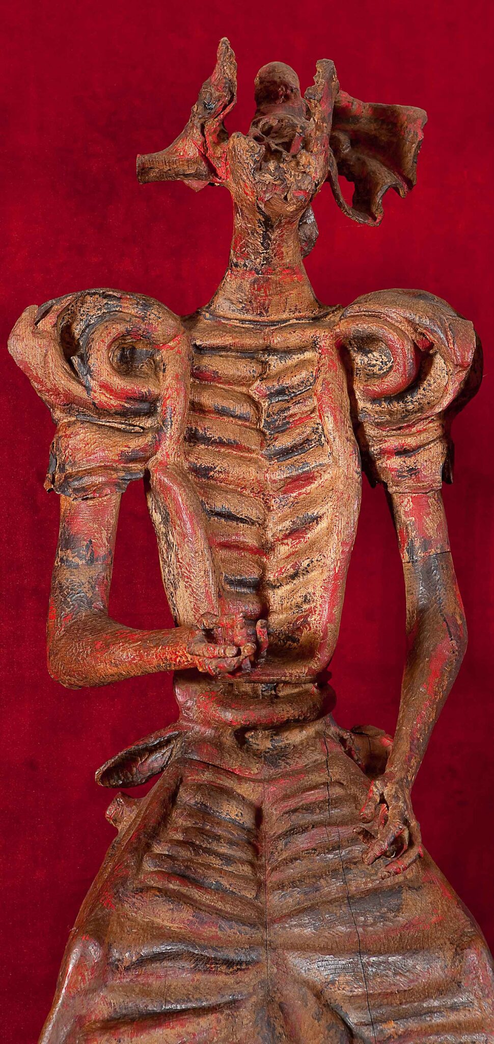 Le figure, infatti, appaiono scarnificate e segmentate, con corpi strutturati da ritmi verticali e superfici incise. Inoltre, la policromia accentua i contrasti e sottolinea la tensione interna delle forme. Di conseguenza, la scultura assume un carattere espressivo che richiama l’interesse dell’artista per il dramma storico e per la dimensione esistenziale, temi già presenti nella sua opera dagli anni della formazione bolognese.