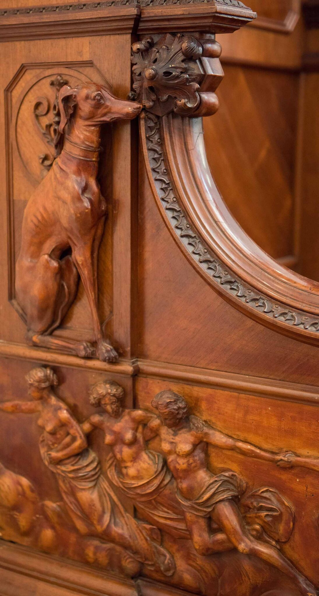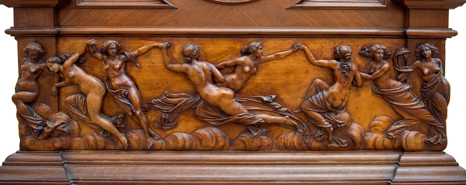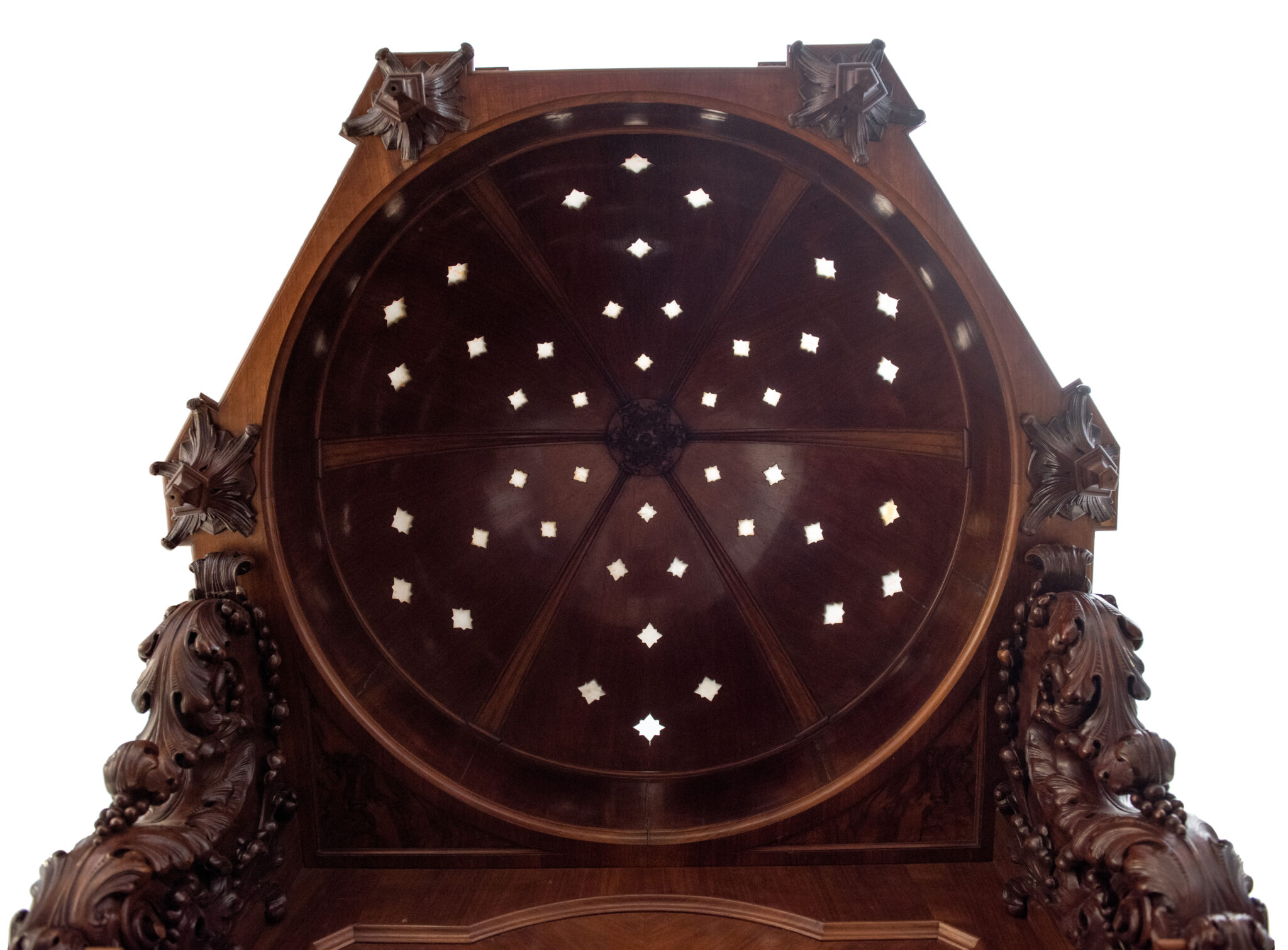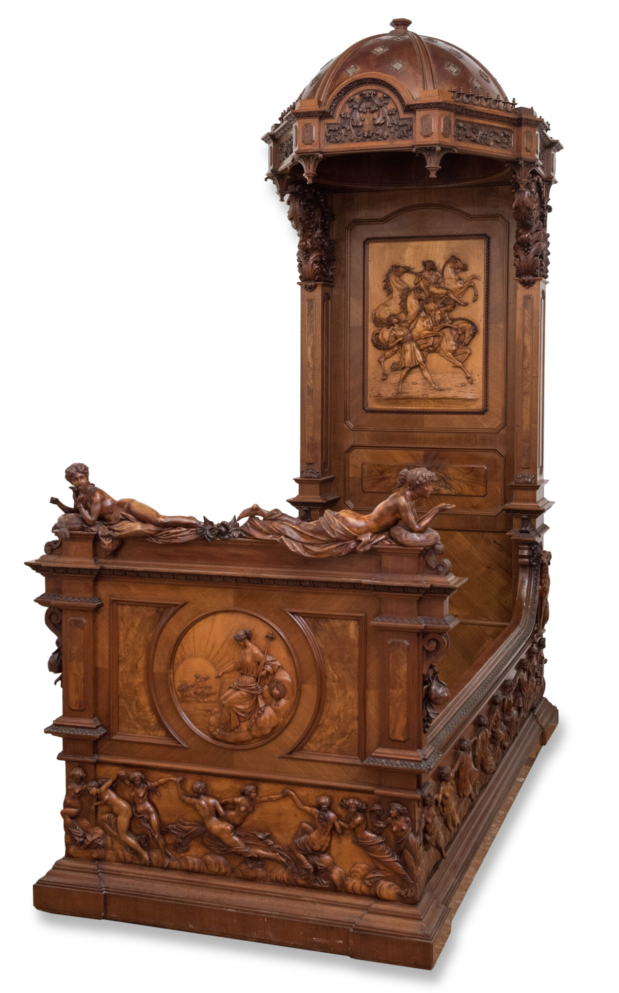 Descrizione: Una piazza, baldacchino di forma architettonica a foggia di volta celeste, poggiante su testiera decorata da pannello con scena di cavalli. Pediera sormontata da figure femminili distese e ornata internamente ed esternamente da riserve con scene mitologiche, fasce esterne con figure danzanti a rilievo, H cm ca 310x257x124, misure interne 233×98.