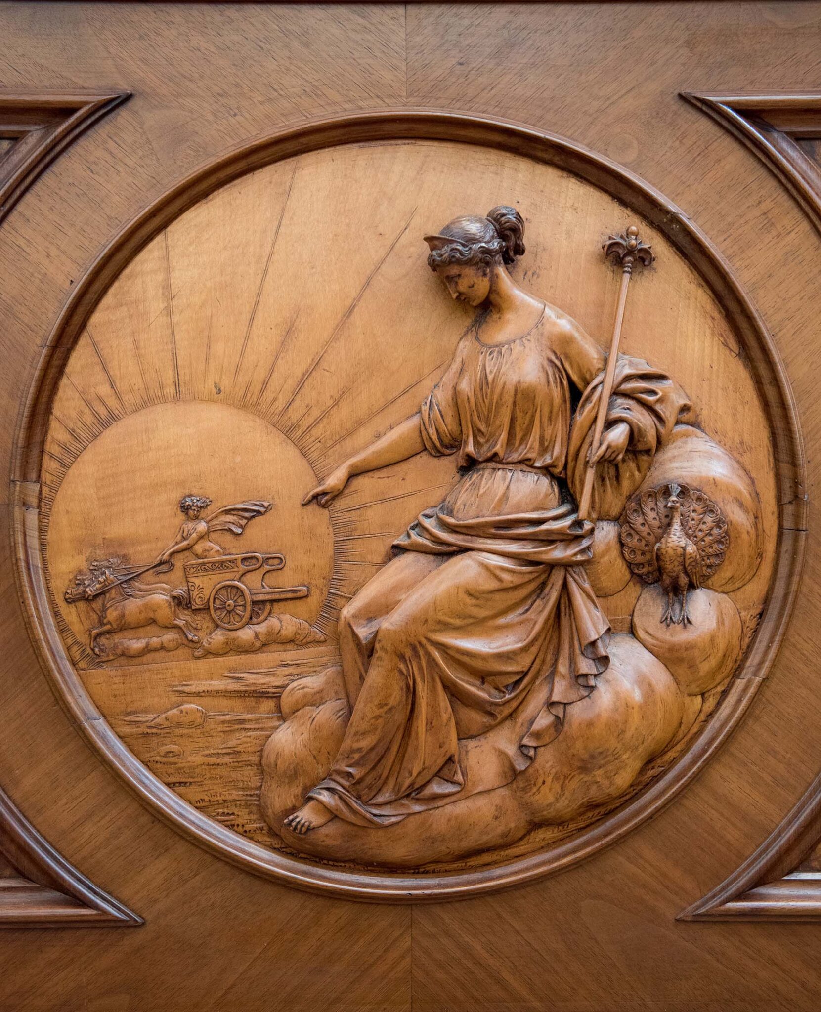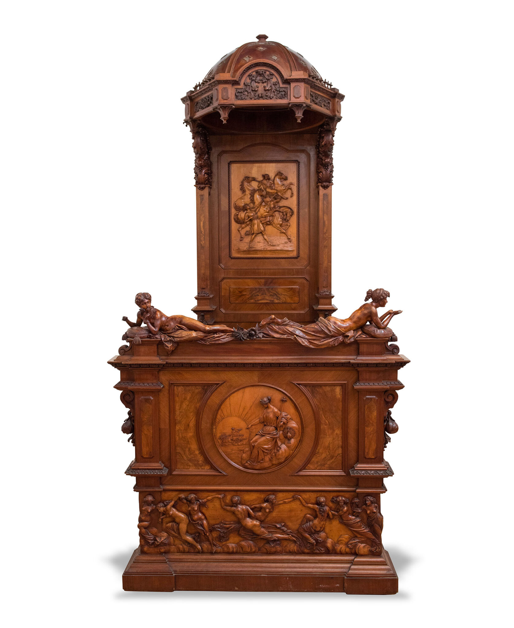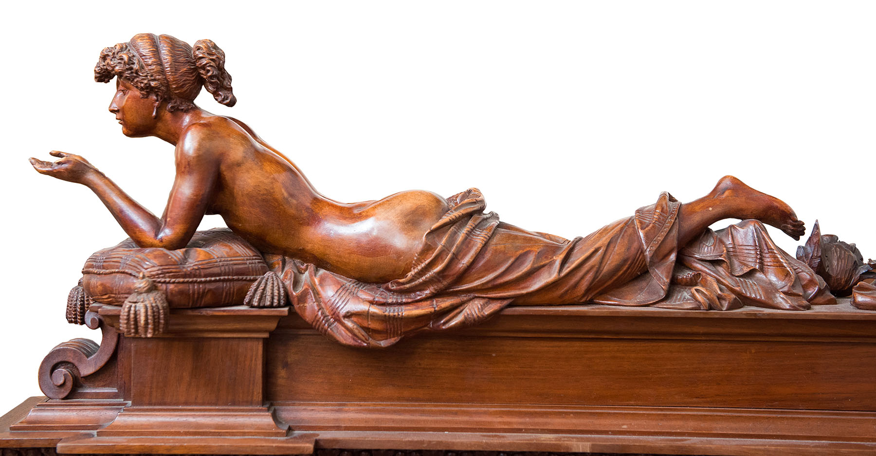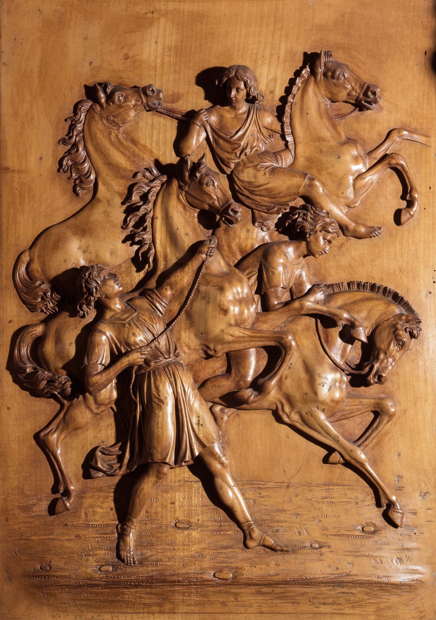 Descrizione: Una piazza, baldacchino di forma architettonica a foggia di volta celeste, poggiante su testiera decorata da pannello con scena di cavalli. Pediera sormontata da figure femminili distese e ornata internamente ed esternamente da riserve con scene mitologiche, fasce esterne con figure danzanti a rilievo, H cm ca 310x257x124, misure interne 233×98.