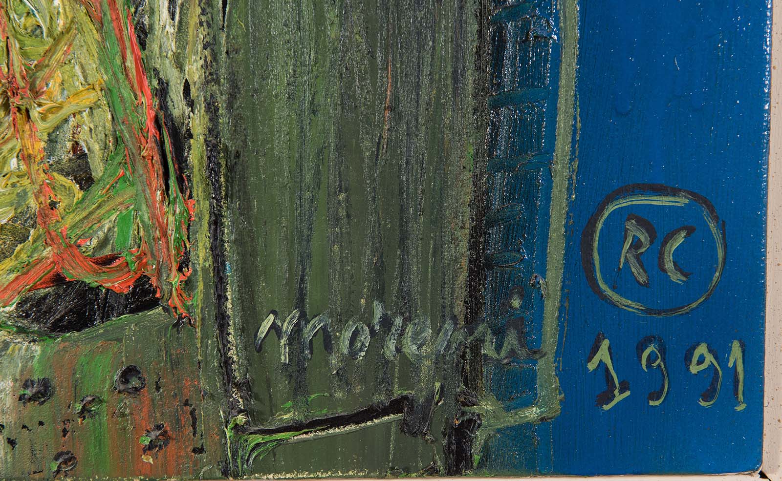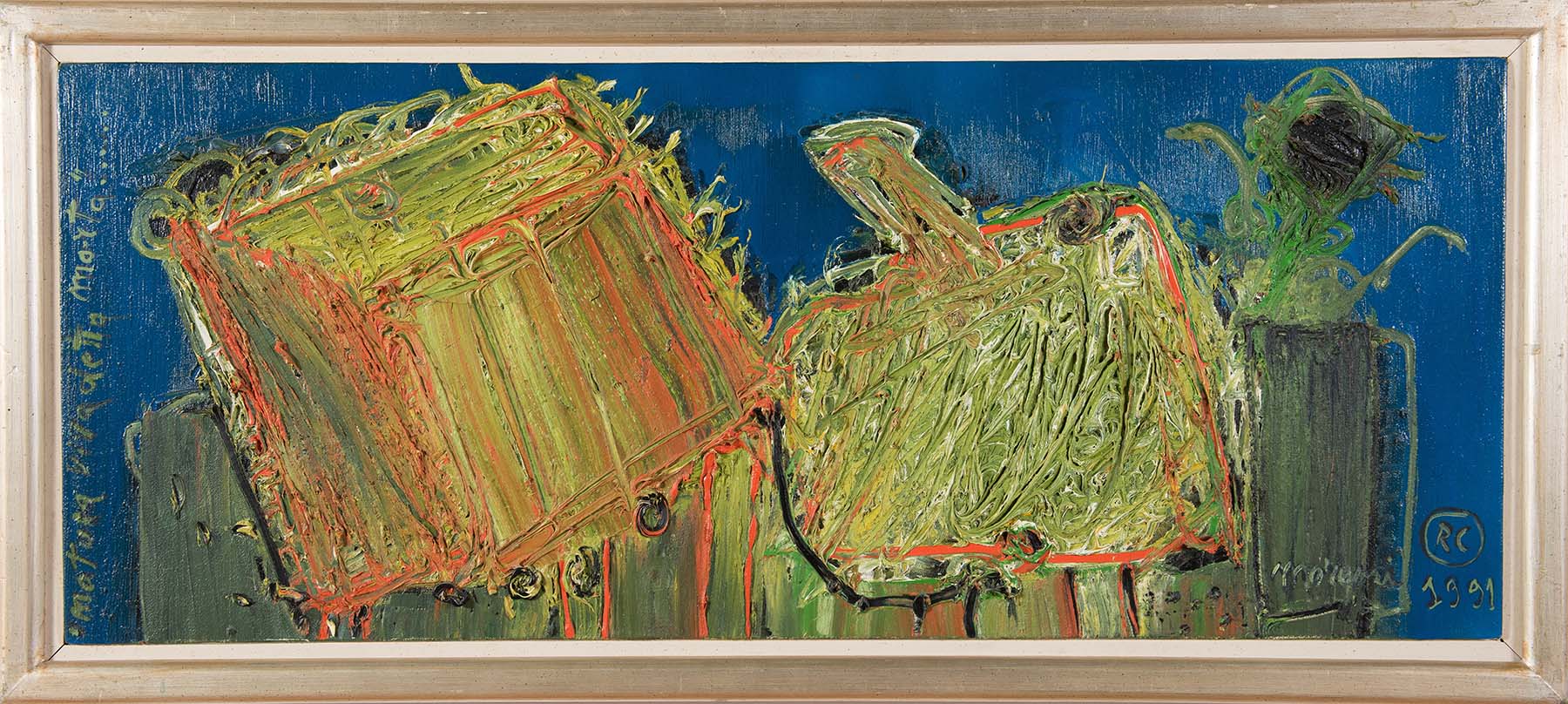 Descrizione: Olio su tela, firmato e datato in basso a destra RC Moreni 1991, al retro reca firma, titolo e data ‘Mattia Moreni – Natura viva detta morta – 1991’, H cm 46×115