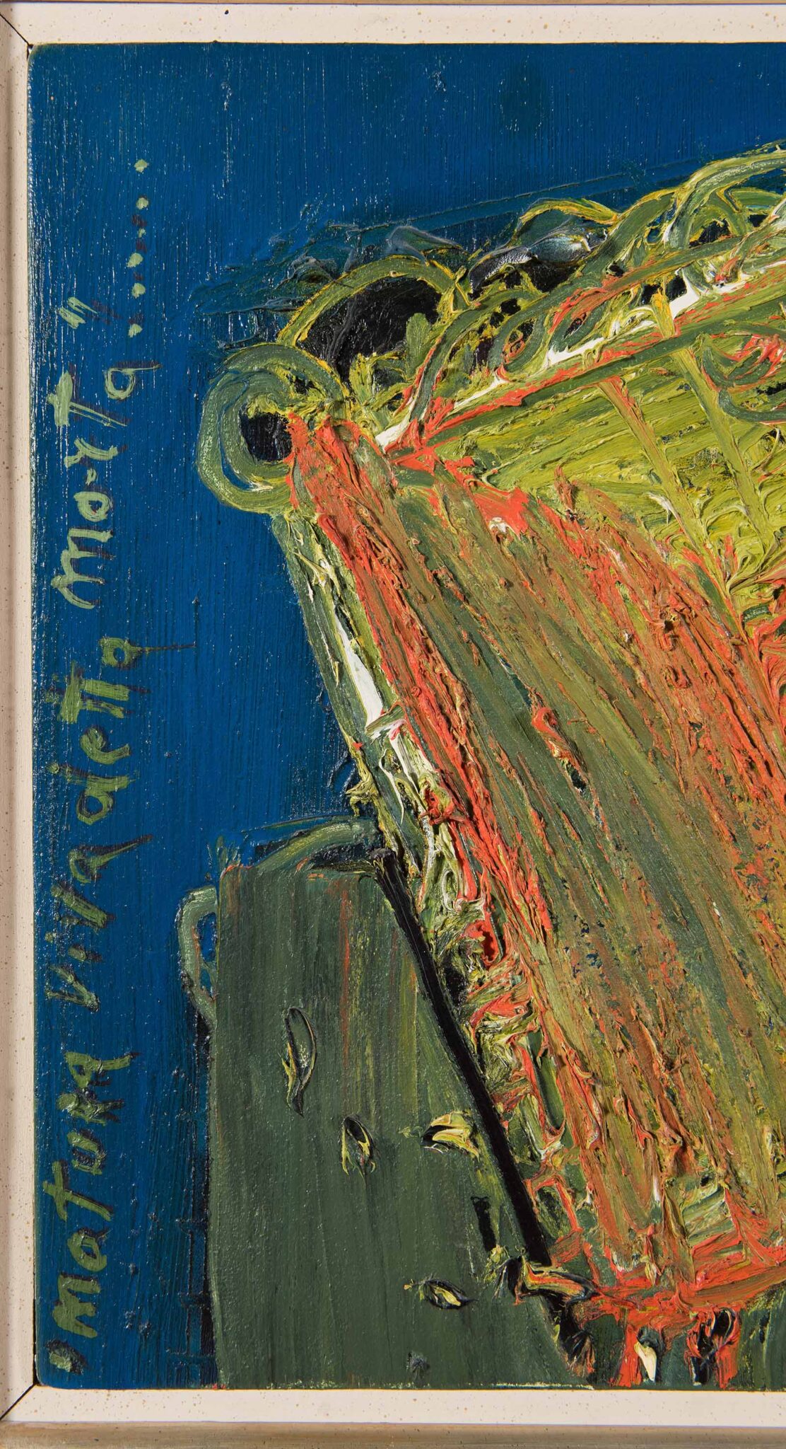 In quest’opera, la tradizionale “natura morta” viene esplicitamente ribaltata già nel titolo. Infatti, l’artista propone una “natura viva”, attraversata da segni nervosi e da una cromia accesa che nega ogni staticità. Inoltre, l’uso dell’olio in spessori marcati costruisce una superficie vibrante, dove oggetti quotidiani – deformati e quasi antropomorfizzati – sembrano animarsi sotto la pressione del colore.