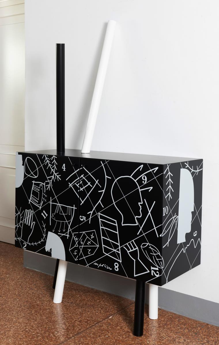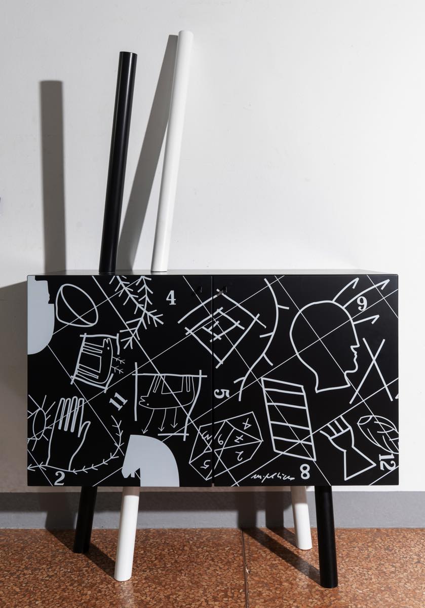 La credenza “Battaglia di San Romano” di Mimmo Paladino presenta un monolite elegante in legno laccato nero opaco, coperto sui tre lati da una fitta decorazione grafica in bianco che richiama segni, numeri e profili stilizzati: un vero e proprio campo visivo in tensione. Sorretta da gambe in metallo verniciato – una nera, una bianca – che contribuiscono a slanciare la forma verso l’alto. Due lance in metallo verniciato trafiggono idealmente la struttura. Emergendo dal corpo e divenendo elementi architettonici che convergono nel piano superiore.