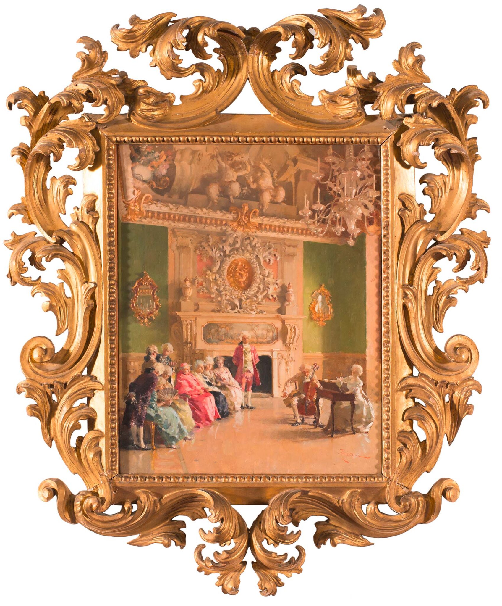 Realizzato nel 1922, come indica il cartiglio autografo sul retro, il dipinto testimonia la continuità di un gusto per la pittura di ambientazione storica, ancora apprezzata nel primo Novecento. “Il concerto” è un’opera che sintetizza eleganza formale, attenzione luministica e sensibilità narrativa, mostrando inoltre la grande capacità tecnica di Paolo Bedini.
