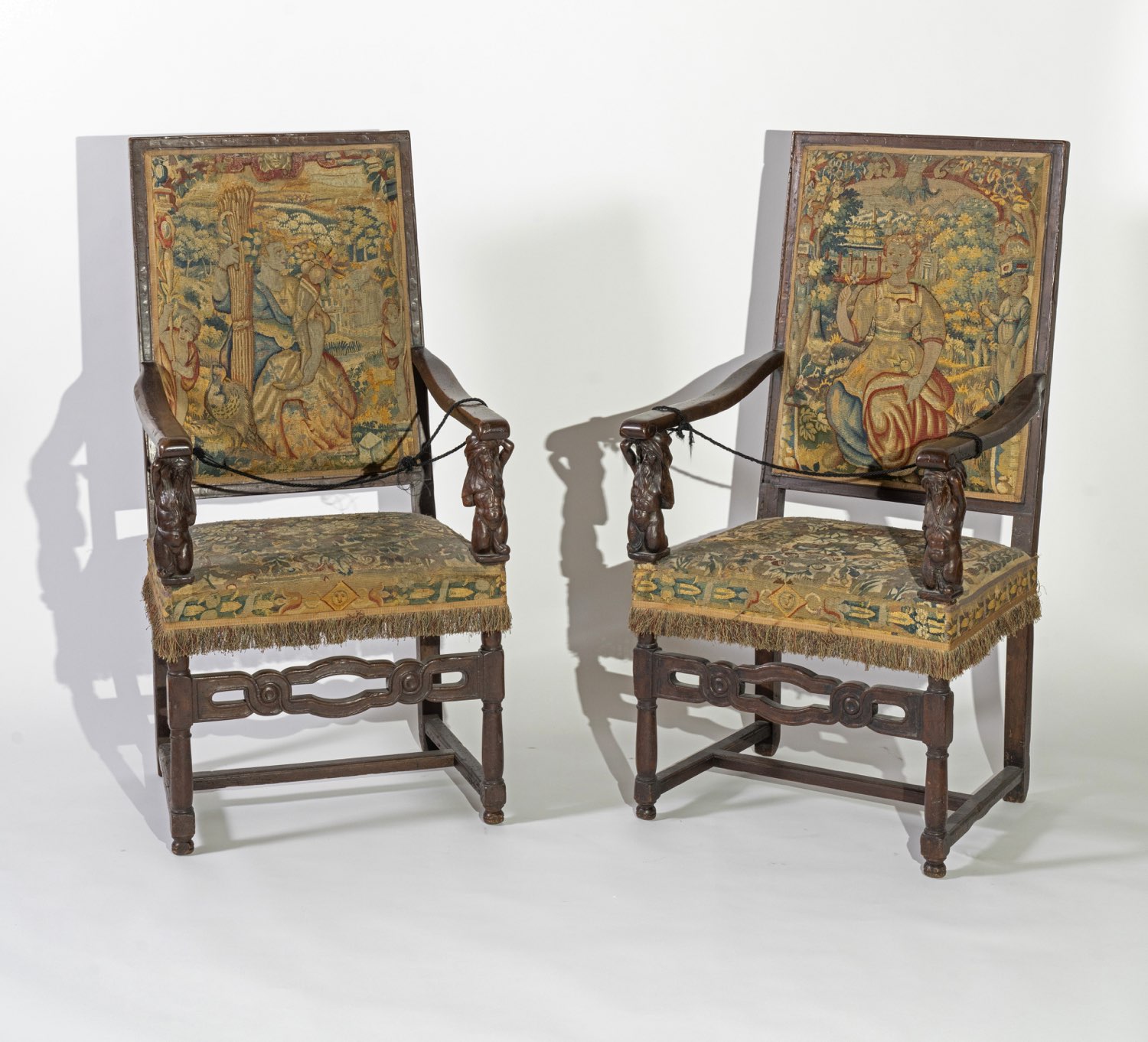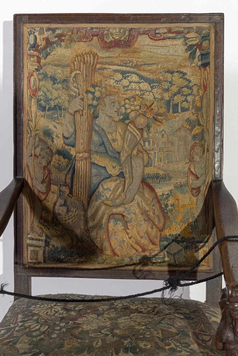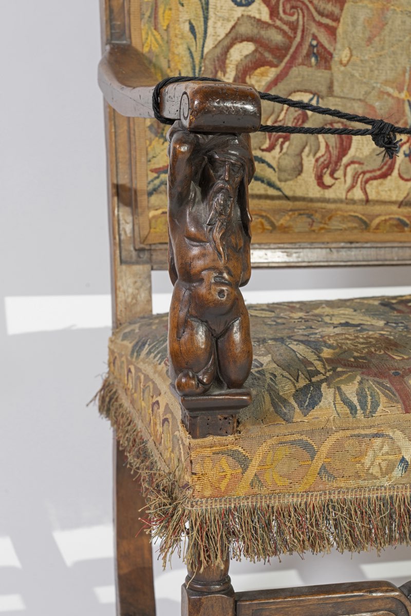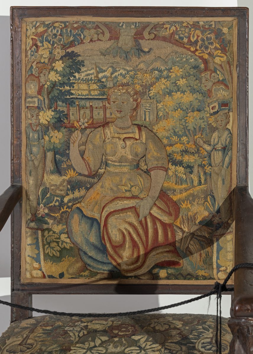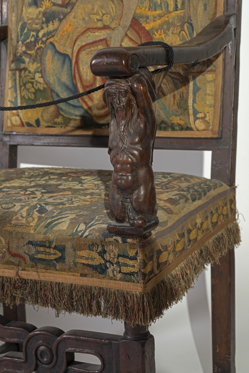 Foderato con arazzi di manifattura fiamminga, appositamente realizzati per gli arredi, braccioli sorretti da cariatidi in legno scolpito; divano: H cm 128x157x63 – seduta H cm 51, poltrone: H cm 127x65x62 – seduta H cm 51.